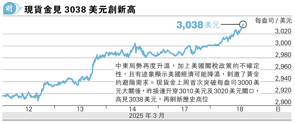 【明報專訊】以巴戰火重燃,加上美國總統特朗普向全球實施對等關稅的威脅逼近,且迹象顯示美國經濟可能放緩,刺激黃金的避險需求。現貨金繼上周首次升穿每盎司3000美元大關,昨接連升穿3010至3030美元關口,高見3038美元,再次刷新歷史高位。期金高見每盎司3047美元,同樣刷新歷史新高。