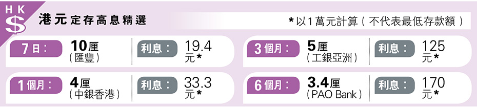 經濟 港元定存1個月年利率有4厘 發佈於 7 個月 前 2025 年 3 月 19 日 By 明報 【明報專訊】中銀香港推出1個月有4厘港元定存優惠,但要選用「綜合理財服務」的個人銀行客戶透過兌換現有外幣資金開立等值港幣5萬元或以上的7天或1個月「特優港元定期存款」。 (請看附圖) 相關文章: Up Next 騰訊第四季多賺90% 勝預期 不要錯過 紀惠連沽兩物業共涉逾4億 繼續閱讀 贊助商 猜你喜歡