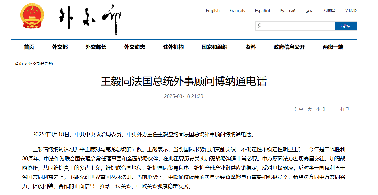 中共中央政治局委員、中央外辦主任王毅3月18日應約同法國總統外事顧問博納通電話。