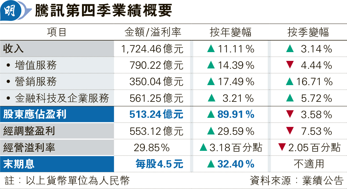 【明報專訊】騰訊(0700)公布截至去年底止第四季及全年業績,第四季盈利增加90%至513.2億元(人民幣,下同),經調整後盈利升近30%至553.1億元,收入升11%至1724.5億元,均勝預期。全年計盈利升68%至1941億元,經調整盈利增41%至2227億元;每股盈利20.938元,末期息多派32.4%至每股4.5港元。