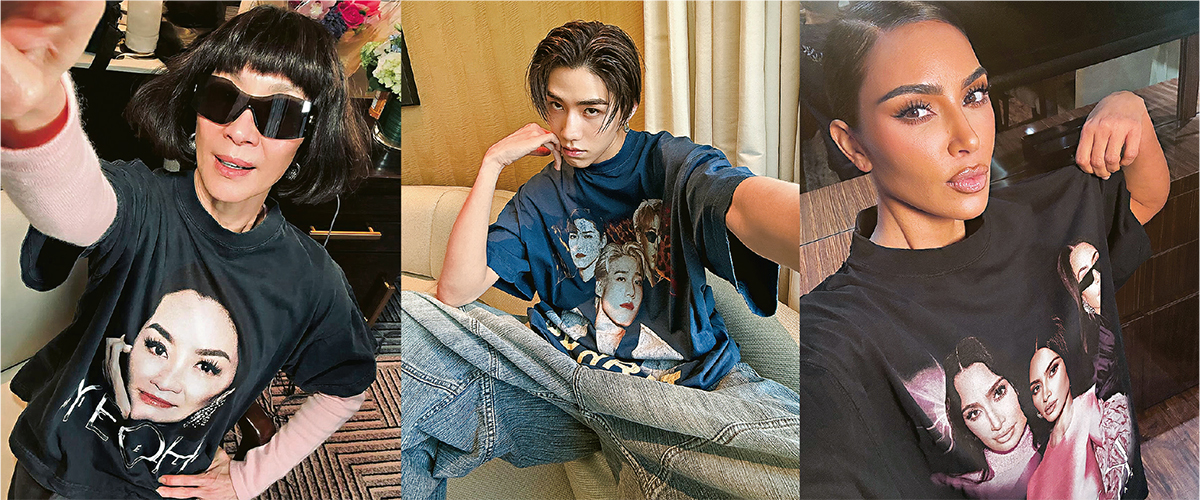 【明報專訊】Balenciaga向來擅長解構流行文化,例如最近推出的Fanclub系列,便將品牌大使楊紫瓊(左)、泰星PP Krit Amnuaydechkorn(中),以及Kim Kardashian(右)等的肖像和名字印在T恤上,模仿1990年代流行的偶像周邊產品。品牌貫徹其玩味作風,邀請一眾品牌大使參與拍攝造型照,分別穿上印有自己肖像和簽名的T恤,再以輕鬆自拍的方式,展現出Fanclub的概念與玩味精神。每款T恤背後的簽名設計,更是模仿以箱頭筆親筆簽名的手寫質感,就像粉絲珍藏多年的偶像簽名產品,不但帶有一種親切的感覺,還有一種偶像與粉絲之間的聯繫,將日常T恤變成故事載體,讓人回想起追星時的那份狂熱。●