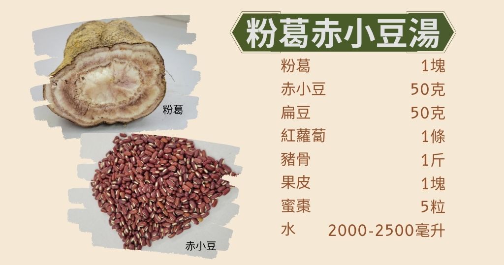 材料︰粉葛1塊、赤小豆50克、扁豆50克、紅蘿蔔1條、豬骨1斤、果皮1塊、蜜棗5粒、水2000-2500毫升
