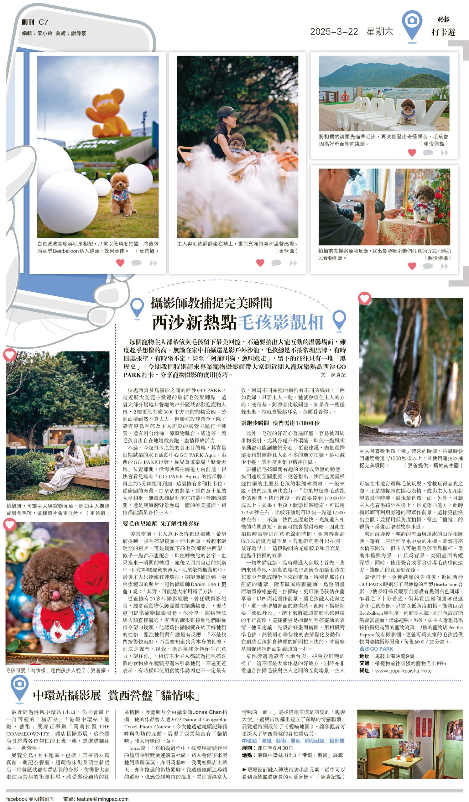 【明報專訊】每個寵物主人都希望與毛孩留下最美回憶,不過要拍出人寵互動的溫馨場面,難度超乎想像的高。無論在家中拍攝還是影戶外沙龍,毛孩總是不按常理出牌,有時四處張望,有時坐不定,甚至「阿崩叫狗,愈叫愈走」,留下的往往只有一堆「黑歷史」。今期我們特別請來專業寵物攝影師帶大家到近期人寵玩樂熱點西沙GO PARK打卡,分享寵物攝影的實用技巧。