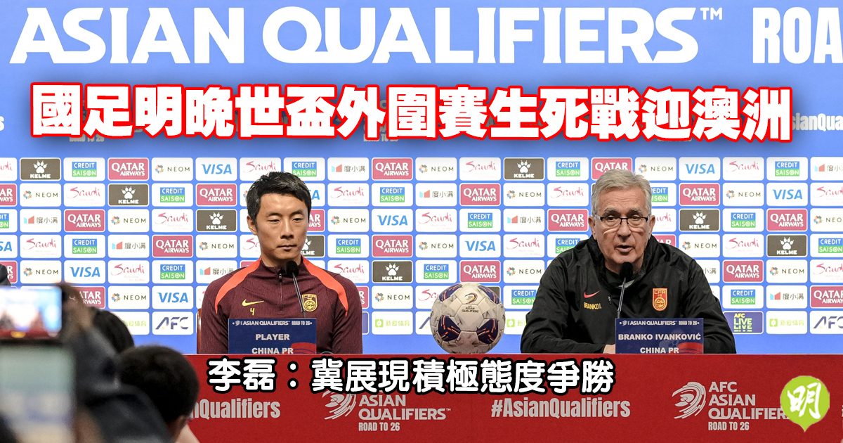 中國男子國家足球隊(國足)明晚(25日)在2026年世界盃亞洲區外圍賽C組第8輪將在主場杭州奧體中心體育場迎戰澳洲隊。這場比賽至關重要下,國足料將全力以赴,爭取在這場生死戰中拚出一線曙光,為出線決賽周保留希望。