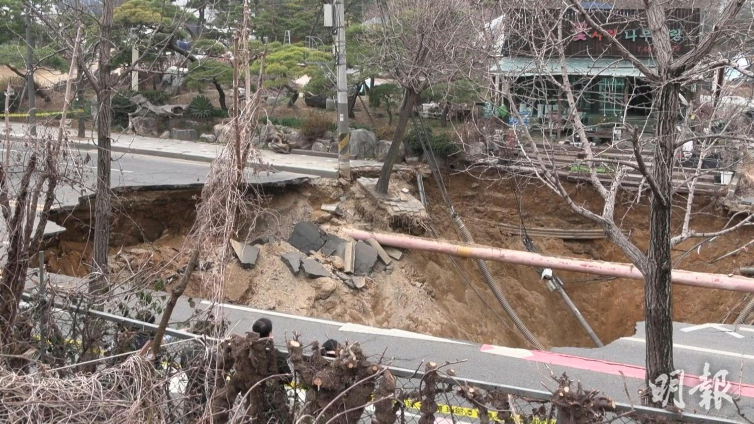 事發周一下午6時半左右,該條往返共6線的行車公路中線近十字路口位置下陷,露出一個直徑約20米、深20米的大坑。駕駛電單車經過的一名姓朴男子墮坑失蹤,後車行車紀錄儀的影片顯示,電單車前方行駛中的一架私家車也差點墜坑,幸最後關頭在坑邊彈回路面,私家車司機受傷送院。