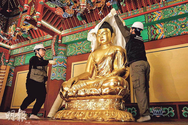【明報專訊】韓國東南部多處山火肆虐4天,其中一股上周五起自慶尚北道義城郡的山火周二(25日)直撲慶尚北道古鎮安東,燒掉了有1300年歷史的義城古剎孤雲寺,還威脅世界文化遺產,包括遠溯14世紀的安東河回村和高麗末期士林求學殿堂的屏山書院。韓國國家遺產廳周二下午5時半發出該廳成立以來,首個國家遺產危機4級警報中最高級別的「嚴峻」警報。消防當局亦將該區的山火級別調升至最高的第三級。因為山火逼近,司法部周二要疏散該區3500餘名囚犯。圖為工作人員昨早預先用防火氈包住孤雲寺佛像,希望能減少受破壞。