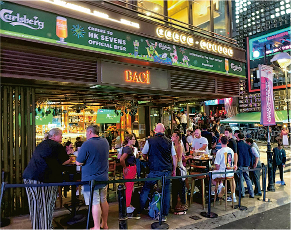 【明報專訊】國際七人欖球賽首度移師啟德體育園,過往受惠於「主場之利」的銅鑼灣酒吧昨人流大減,有酒吧負責人稱客量比往年少約一成;因應賽事不在大球場舉辦,亦有酒吧取消往年憑票尾獲優惠的安排。相反在中環,蘭桂坊協會總監張素媚稱因酒吧營業時間較體育園長,加上賽事期間部分酒吧推出七欖優惠等,昨晚生意額較去年錄約一成增長,對本周末生意抱持樂觀。