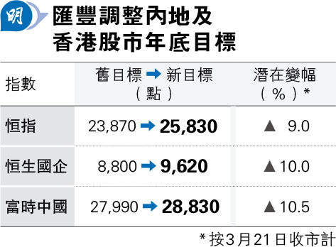 匯豐繼1月後,發出最新報告,再度上調恒指今年底目標外,亦把國指目標調高9.3%,至9620點,潛在升幅11.78%;富時中國指數目標由27,990點,調高3%,至28,830點。報告認為,市場出現新機會,如人工智能帶動中國股市上升,並透過企業盈利提升支持,由於市場預測企業盈利增長10%屬溫和,或為股市向上帶來驚喜,而這種趨勢正蔓延至港股。