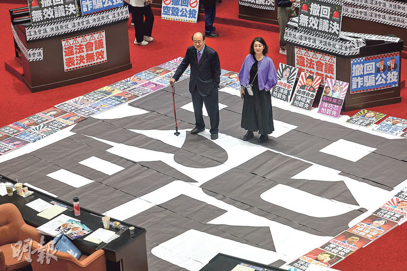 中國 質疑公投案闖關表決無效 綠委佔立院主席台 發佈於 7 個月 前 2025 年 3 月 29 日 By 明報 【明報專訊】台灣立法院周二(25日)對反廢死、反戒嚴公投案二讀,昨日原定計劃確認議事錄。民進黨立委不滿會議違法、主張表決無效,搶先在昨早7時霸佔主席台,並在議場佈置封條,在地面擺上一個大大的「罷」字。截至晚上6時,立法院長韓國瑜未進場宣布開會。圖為民進黨立法院黨團總召集人柯建銘(左)和黨團幹事長吳思瑤(右)站在「罷」字上。 (中央社) 相關文章: Up Next 菲任2026年東盟主席國 專家:南海行為準則磋商不順 不要錯過 拍解放軍演習畫面差傳送慢 台軍3輔導長遭調職引不滿 繼續閱讀 贊助商 猜你喜歡