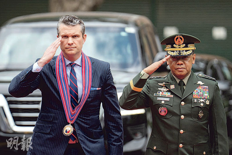 【明報專訊】美國國防部長海格塞斯(Pete Hegseth)昨訪問菲律賓,會晤菲律賓總統小馬可斯時強調美菲須「肩並肩」面對中國帶來的威脅,確保南海航行自由;他稱會向菲律賓部署先進戰力,並重申美國對共同防禦條約堅若磐石的承諾。