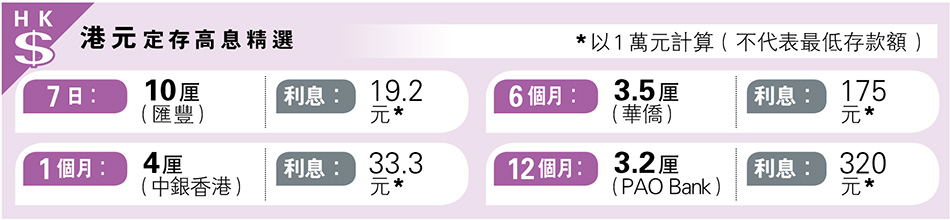 經濟 港元定存匯豐7日年利率見10厘 發佈於 6 個月 前 2025 年 4 月 1 日 By 明報 【明報專訊】港元定存高息精選7日見10厘,為匯豐卓越理財尊尚客戶以新資金兌換指定貨幣並開立定存之優惠年利率。 (請看附圖) 相關文章: Up Next 上嵐一房336萬沽 8個月炒貴7% 不要錯過 財政部央企5200億注4內銀 發A股形式增核心一級資本 相隔15年再有注資 繼續閱讀 贊助商 猜你喜歡