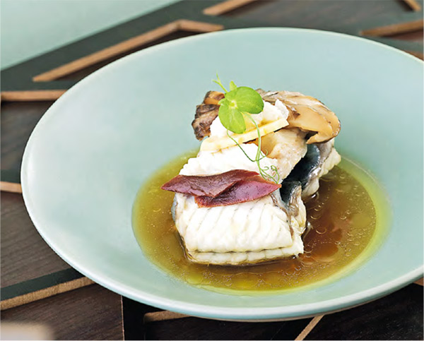 另一道新菜式金湯魚肉獅子頭則演化自傳統淮揚菜獅子頭而成,廚師選用新鮮魚肉手打至起膠後,加入白蘿蔔塑形成球,再搭配以南瓜、紅蘿蔔、瑤柱、蝦乾、螺頭、鮮雞腳、忌廉與雞湯調製而成的金湯。不似傳統獅子頭般充滿濃濃油汁,由魚肉製成的獅子頭口感鬆軟清甜,南瓜的自然甜味與雞湯的鮮味豐富了口感層次,令整道菜式保留了傳統獅子頭湯汁的厚重感而顯得清新不膩。●