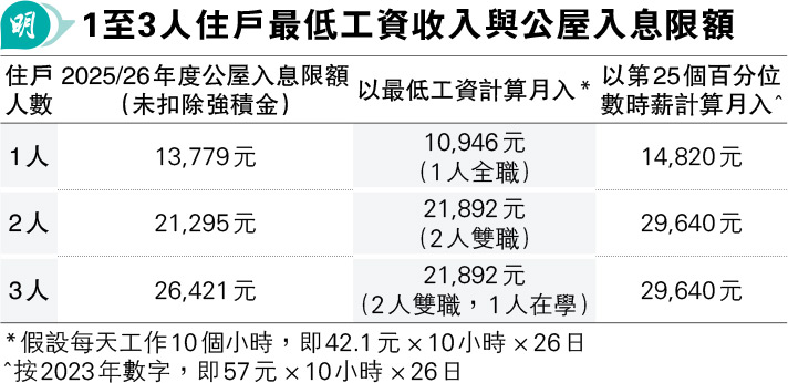 【明報文章】近期公屋入息限額又再次引起熱議。房委會公布2025/26年度公屋入息限額水平,建議平均增加1.7%;按新入息水平,估算今年5月1日實施最新法定最低工資之後,領取最低工資的勞工(特別是2人住戶),可能不符合申請公屋資格。以2人雙職住戶為例,假設正從事最低工資水平工作,以新水平時薪42.1元計算,每天工作10個小時,每月工作26天,住戶入息便已經達到21,892元,高於2人住戶申請公屋的入息限額(21,295元),因而不符資格申請公屋。