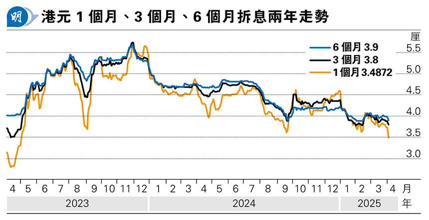 【明報專訊】港元拆息在季結後持續回落,與按揭利率相關的1個月拆息昨日報3.4872厘,較周二跌13.84點子(1厘等於100點子),為2023年5月以來最低。1周拆息跌21.26點子,至3.1244厘。與銀行資金成本關係較大的3個月拆息跌3.13點子,報3.8厘,6個月拆息則跌4.81點子至3.9厘,均為2月中以來最低。
