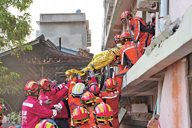 【明報專訊】緬甸3.28大地震今天踏入第6天,死亡人數昨超越3000,但災場亦傳出救人好消息。緬甸當地時間4月2日下午約5時40分,在曼德勒市金色鄉村酒店救援點,中國救援隊、中國國際救援隊成功救出一名被困超過120小時52歲男子。中國香港特區救援隊、深圳公益救援隊亦參與這次聯合救援。本港保安局局長鄧炳強昨晚形容對最新救人消息「既開心感動又驕傲」。這是中國救援隊伍在緬甸救出第9名倖存者。由緬甸和土耳其組成的搜救隊周三凌晨則在內比都一座倒塌酒店瓦礫堆中,救出一名被困5天的26歲酒店男職員。