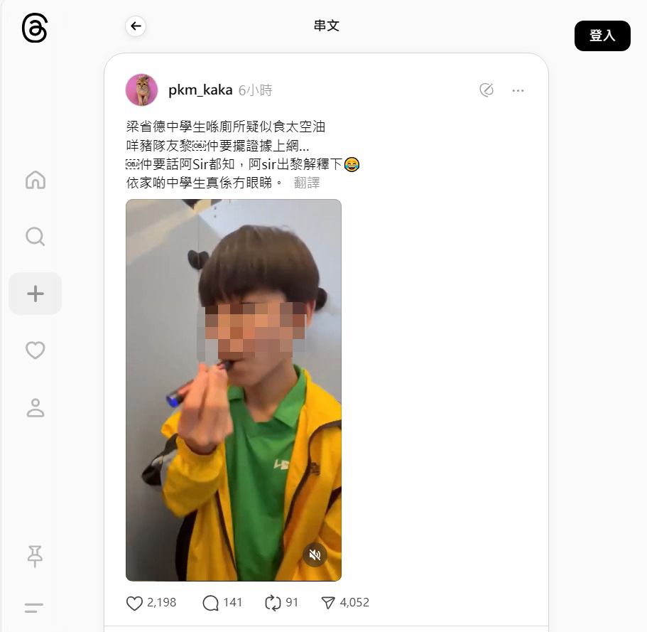 在Threads流傳的涉事影片在今午3時上載,至晚上9時已有逾1900人表情回應該帖文。帖文附上的影片在廁格內拍攝,有兩名穿校服的學生入鏡,其中一人手持疑似電子煙吸食;連同拍攝者,共有4人同在廁格內。其中一名穿校服學生說「冇所謂啦,好多人都知㗎啦,葉sir都知啦」。
