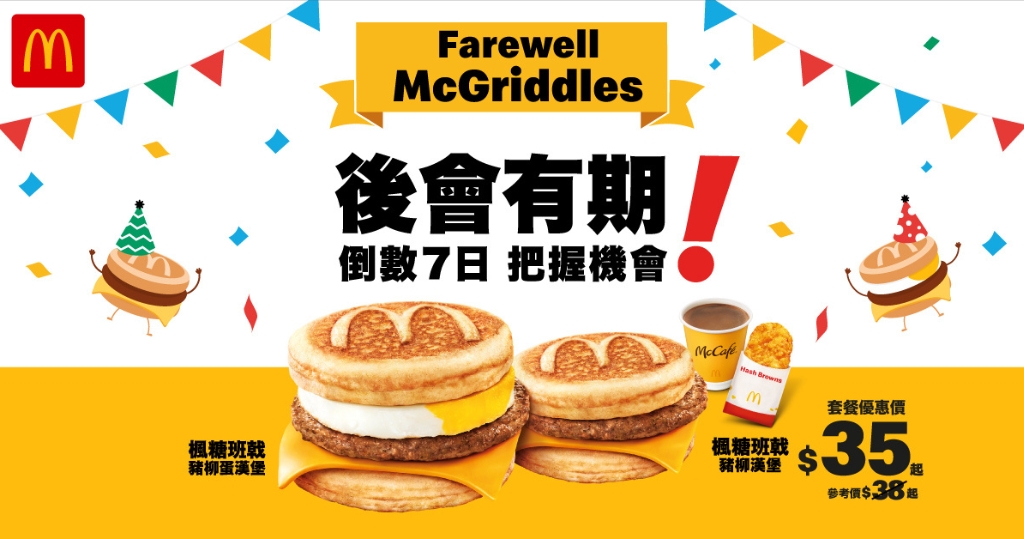 即時熱點 香港麥當勞:McGriddles供應至4月9日 (18:11) 發佈於 6 個月 前 2025 年 4 月 2 日 By 明報 麥當勞楓糖班戟漢堡系列(McGriddles)將於4月9日起陸續暫別全線餐廳,楓糖班戟豬柳蛋漢堡套餐(配薯餅及飲品)及楓糖班戟豬柳漢堡套餐(配薯餅及飲品),會以套餐優惠價$36.5起及$35起供應至最後。 註:兩款楓糖班戟漢堡套餐供應時間為上午4時至11時,供應地點不包括九龍站、山頂廣場、海洋公園、沙田馬場及跑馬地馬場的麥當勞餐廳。套餐優惠價不適用於香港國際機場內所有餐廳。 相關文章:楓糖班戟漢堡系列楓糖班戟豬柳漢堡楓糖班戟豬柳蛋漢堡熱門HOTPICK編輯推介麥當勞 Up Next 日本賞櫻|7種常見櫻花種類介紹 (14:00) 不要錯過 的士車隊「JOIE樂行」試運 需提早1小時預約【附用App叫車教學】 (13:21) 繼續閱讀 贊助商 猜你喜歡 富士山頂氣溫正以每百年1.47°C速度上升 (14:37) 無花果助穩血壓有益心臟 營養師︰腎病、腸胃敏感者慎食【附無花果簡易食譜】 (13:15) 無花果愈深色愈甜?青色無花果有何分別?短片睇果商教揀無花果 (12:44) 中秋好去處2025|西九寵物區「人寵步行嘉年華」 免費入場贏奬品慶中秋 (10:43) 中秋綵燈好去處2025|短片:5米巨兔抱月登陸啟德 維園熊貓燈飾、大澳花燈搖櫓同慶中秋 (09:16) 短片:阿富汗恢復網絡 市民機不離手現笑容 (13:55)