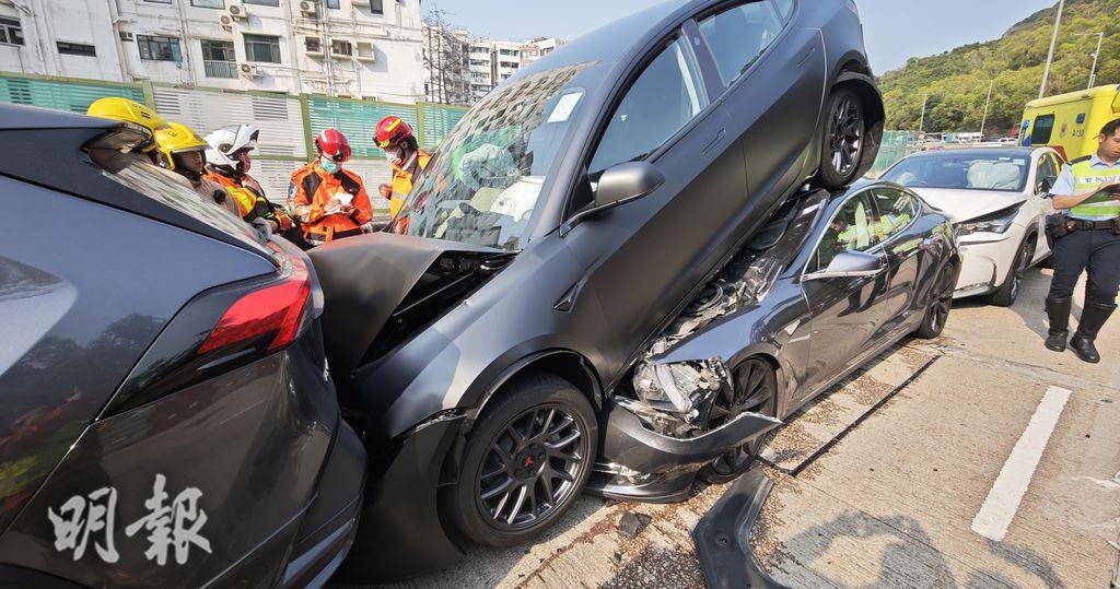 即時港聞 龍翔道7車串燒相撞6人傷 Tesla被剷壓另一車頂 (11:19) 發佈於 6 個月 前 2025 年 4 月 3 日 By 明報 今晨(3日)7時許,龍翔道往觀塘方向筆架山道對開發生7車相撞,意外涉及7輛私家車,包括4輛Tesla電動車,其中一輛Tesla被尾隨另一輛Tesla撞尾剷起,壓住後車車頂。救援人員接報到場,意外中5男1女受傷,均清醒由救護車送伊利沙伯醫院。 據最前寶馬私家車男司機稱,當時沿快線行駛,因前方車輛突然急煞,他亦立即煞車收慢,未有撞及前車,但尾隨車輛懷疑收掣不及相繼撞上,導致7車連環撞,前方車輛事後駛離,他的座駕尾部有輕微損毀。 消防事後檢查涉事電動車狀況,並以工具穩固被剷起的車輛,待拖車到場拖走。 相關文章:交通意外編輯推介 Up Next 醫衛局批《星島》控煙政策報道內容失實 《星島》回應指旨在反映議員及業界關注 (16:16) 不要錯過 火炭謀殺案 疑犯泰國落網 (00:13) 繼續閱讀 贊助商 猜你喜歡 私家車鬧市撞4車釀7傷 揭司機藏毒被捕 佐敦道私家車失控撞4車 多名途人受傷送院救治 (15:22) 佐敦道私家車連撞4車7人傷 當中男途人命危 (18:25) 長沙灣的士七人車相撞5人傷 不排除有人疑衝紅燈肇禍 (19:24) 的士旅遊巴金鐘道相撞 的士司機受傷 (11:25) 旅巴香園圍撼橋底削頂14傷 司機疑不熟路 涉事路段非首出意外