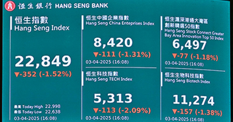 【明報專訊】美國在本港時間昨日凌晨公布對等關稅措施,將美國所有進口貨品有效關稅稅率提升至兩成以上,市場憂慮拖累環球經濟增長,同時阻延美國減息,拖累標指期貨即時急挫逾3%。市場計算中國進口貨品平均關稅累加至約65%,加上東盟亦被課以兩成至四成關稅,累及服裝、航運等外貿相關行業港股下挫,恒指昨日低開560點,低見22,638點見一個月低位,不過隨後在50天線(22,652點)獲支持,收市報22,849點,全日跌幅收窄1.52%或352點。