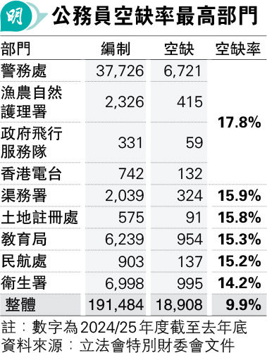 【明報專訊】近年公務員離職人數高企,公務員事務局回覆立法會特別財委會,交代2024/25年度(截至去年12月)各部門空缺率,警務處、香港電台、漁護署及飛行服務隊的空缺率同為17.8%,冠絕所有政府部門。當中警隊空缺職位共6721個,是各部門最多。