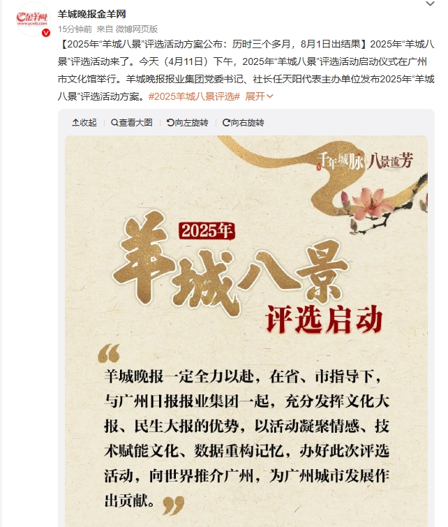 即時兩岸 廣州再評「羊城八景」 八一有結果 (21:23) 發佈於 6 個月 前 2025 年 4 月 11 日 By 明報 2025年「羊城八景」評選活動4月11日在廣州市文化館新館啟動。結果將於8月1日正式公布。 「羊城八景」評選始自宋朝年間,宋、元、明、清歷代相沿,從未間斷。廣州《羊城晚報》在1963年發起了新中國成立後第一次羊城八景評選,之後「羊城八景」於1986年、2002年、2011年進行了四次評選。 此次評選活動將通過「線上投票+市民參與+專家評審」的方式,選出新「羊城八景」,體現廣州在新時代的新發展、新進步、新面貌。評選啟動現場還發布了「羊城八景」LOGO。(綜合報道) 相關文章:廣州旅遊編輯推介羊城八景 Up Next 關稅戰 | 中國在WTO追加起訴美進一步提高對華關稅措施 (00:59) 不要錯過 關稅戰|回應是否與美談判 商務部:談,大門敞開 打,奉陪到底 (15:41) 繼續閱讀 贊助商 猜你喜歡 國慶長假大城提前塞車 多地政府讓車位 雲南轉動21米高經筒 香格里拉古城尋找心中日月 河谷下榻藏族「農舍」 體驗藏民生活 灣區熱搜:兩城際線開通 「灣區地鐵網」成形 林峯廣州騷場館冒煙取消 拍片交代致歉 華南理工大學校內車禍 肇事者疑為老師 撞斃大一新生 (00:02)