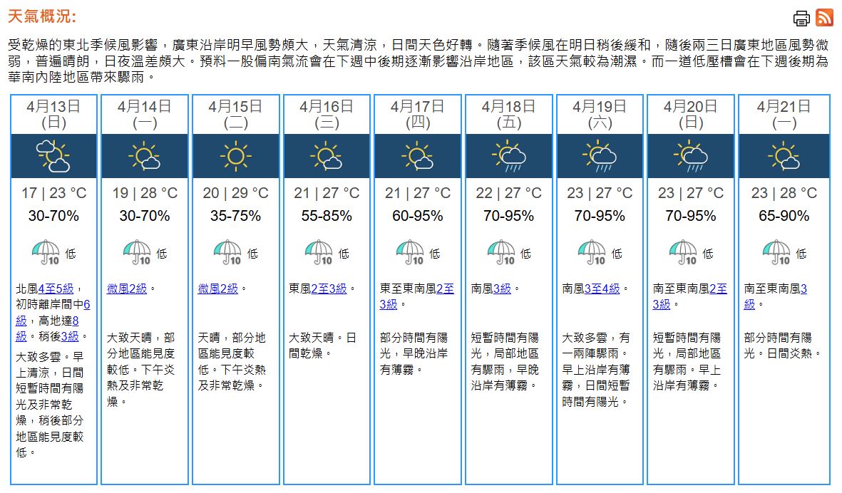 即時熱點 天氣|天文台:周日最低17°C 日間有陽光及非常乾燥 (18:50) 發佈於 6 個月 前 2025 年 4 月 12 日 By 明報 天文台預測,今晚(12日)及明日(13日)大致多雲,初時有幾陣驟雨及雷暴。晚間天氣顯著轉涼,明早最低氣溫約17°C。日間短暫時間有陽光及非常乾燥,最高氣溫約23°C。吹清勁至強風程度偏北風,初時離岸及高地間中吹烈風。明日稍後風勢緩和,部分地區能見度較低。 展望隨後兩三日大致天晴及非常乾燥,日夜溫差頗大。下周後期天氣較為潮濕。(天文台) 相關文章:天文台天氣天氣速遞編輯推介 Up Next 空氣質素健康指數風險 今日料「嚴重」 (10:41) 不要錯過 關稅戰新消息(4月11日) (16:30) 繼續閱讀 贊助商 猜你喜歡 周末近天文大潮 強颱料入400公里 天氣|天文台:大致天晴 日間酷熱及乾燥 (08:17) 天氣|天文台:周四天晴 日間酷熱最高33°C (21:14) 天氣|天文台:天晴酷熱 周末期間風勢頗大有驟雨 (08:21) 天氣|天文台:周三天晴酷熱 最高氣溫33°C (21:16) 天氣|天文台:早上局部地區有驟雨 最高氣溫32°C (08:17)