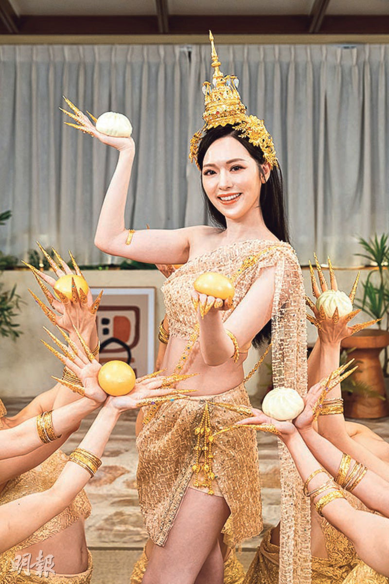 【明報專訊】馮盈盈以「潑水節女神」造型為泰式新產品拍攝宣傳片,一身泰服的她還大跳祝福舞蹈,並率先試食3款新產品,但為保持最佳身形,不敢放縱大吃。她說學習祝福舞蹈的體驗難忘,「這種舞比我想像中消耗更多體力,雖然沒有跳躍等大動作,但要做到跟足拍子,以及精準舞姿,真的是從手指頭以至腳趾尖都不能鬆懈,幸好遇上非常好的團隊,排練出默契,有幾個鏡頭一次過,順利完成非常有滿足感」。