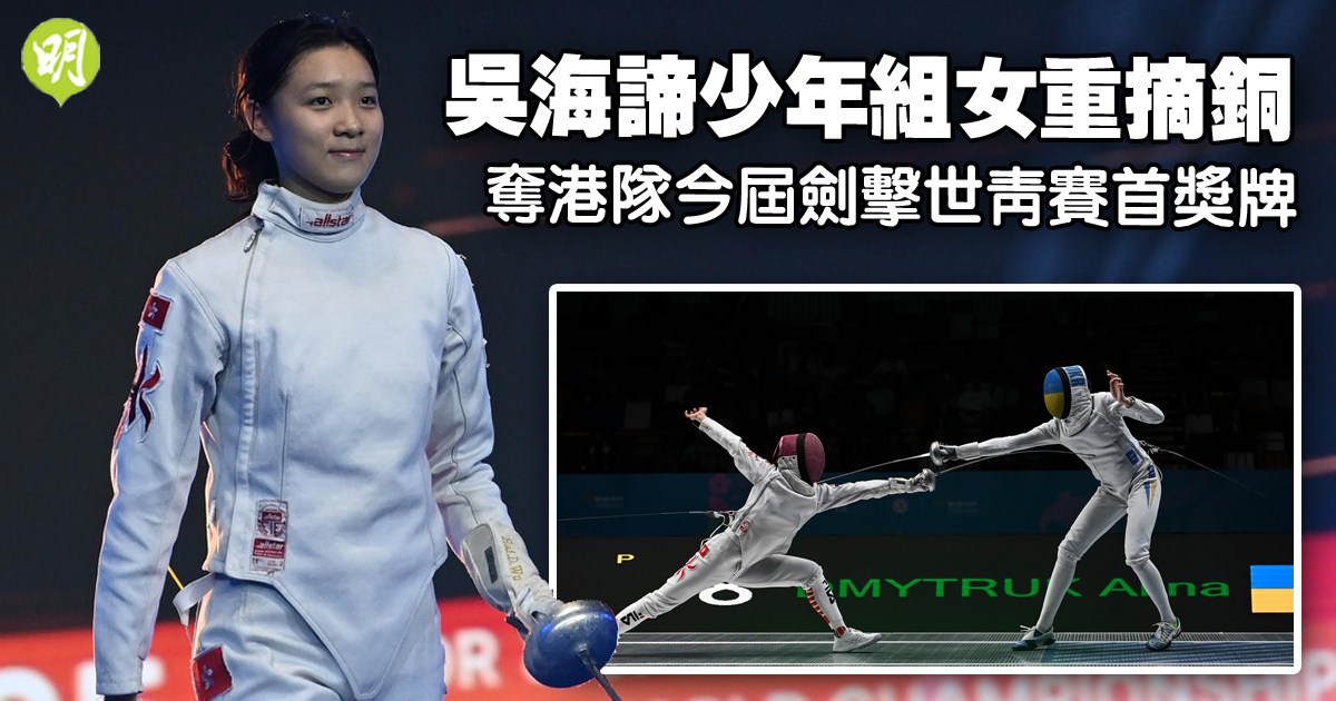 在中國無錫舉行的劍擊世青賽今日(14日)上演少年組重劍個人賽,港隊15歲女將吳海諦過關斬將殺入4強,終不敵烏克蘭隊劍手無緣決賽,獲得一面銅牌,乃港隊今屆世青賽首面獎牌。