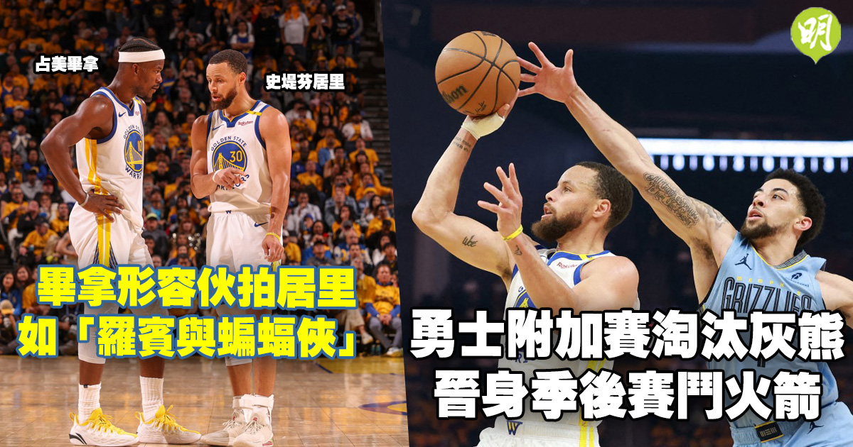 金州勇士今早(16日)在季後附加賽憑兩大球星「咖喱仔」史堤芬居里及占美畢拿聯手轟入75分下,主場以121:116險勝有摩蘭特一度扭傷離場治療的孟菲斯灰熊,取得西岸7號種子資格,下周一起將在季後賽首圈硬碰2號種子的侯斯頓火箭。今仗攻入38分的占美畢拿賽後將DC漫畫角色羅賓比喻成自己,並表示接下來的季後賽將為「蝙蝠俠」居里提供火力支援。