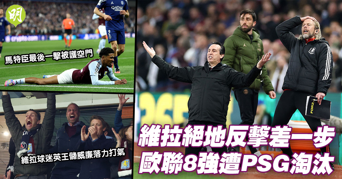 相隔41年後再戰歐聯賽場的英超球隊阿士東維拉,今晨(16日)在歐聯8強次回合對法甲豪門巴黎聖日耳門(PSG)一役展現不屈鬥志。儘管首回合落後1:3,今仗返主場早段更再先失兩球,但維拉其後連追3球重燃出線希望,最終狂攻下主場3:2反勝PSG而回,兩回合計以4:5僅負出局。賽後主帥艾馬利盛讚麾下表現已令其自豪,接下來將放眼英超爭奪下屆歐聯席位。