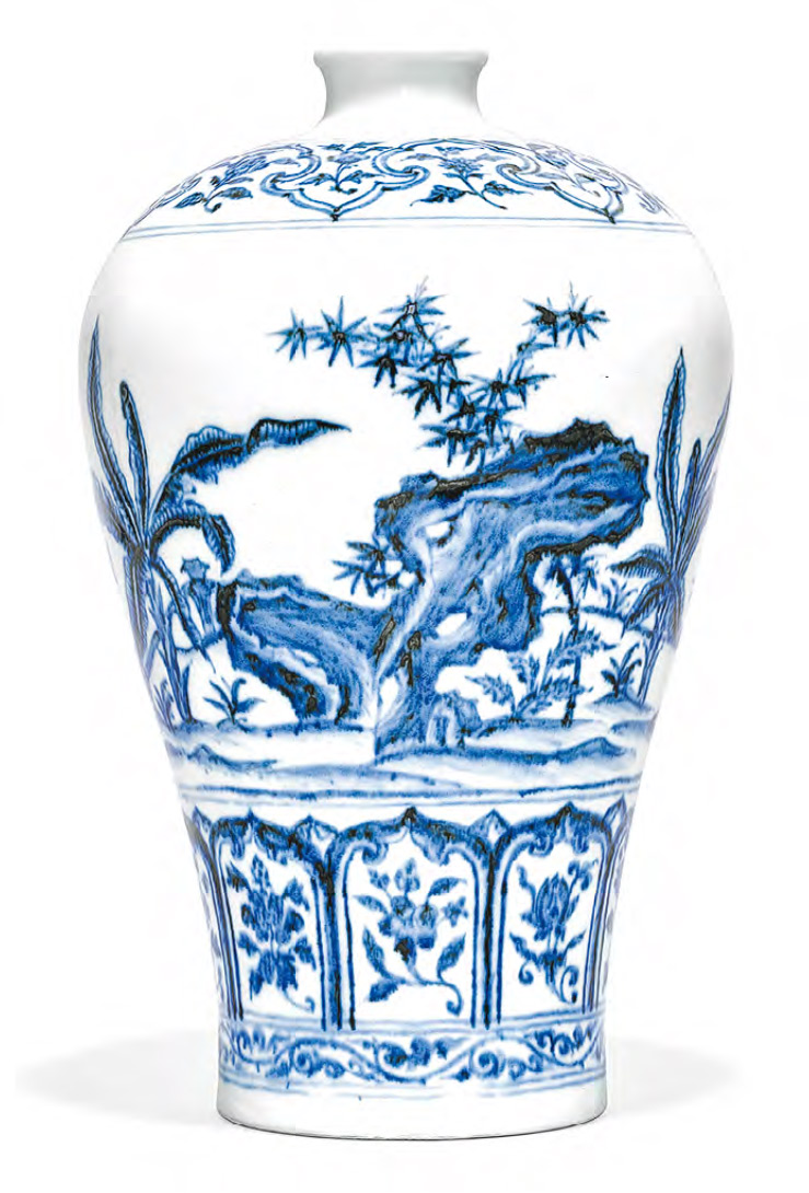 拍賣行指,這專場揭示了近4個世紀以來青花瓷在製作工藝、風格創新之演變歷程。其中於明永樂時期精製的青花竹石芭蕉紋梅瓶形態優美,紋飾極雅致,繪以活潑生動的翠竹、湖石和芭蕉的庭院風景。此品展示永樂早期御器廠以青花鈷料繪畫釉下彩紋飾的完美工藝,其用上蘇麻離青顏料,其中一個特徵是有黑色的結晶斑,此瓶便細緻地展示蘇麻離青結晶斑的深淺濃淡層次。