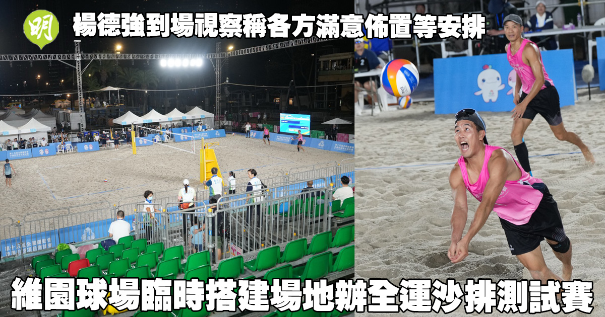 沙排乃香港在全運會承辦的8個競賽項目之一,賽會在維園足球場臨時搭建兩個比賽場地及一個熱身場地。賽事除了吸引男、女子各8支本地隊伍,男子組另邀請廣東代表譚華鋒/鄭銘毅出戰。楊德強晚上到場視察,稱與中國排球管理中心專家、香港排總及參賽運動員互動後,各方對測試賽場地佈置、四周環境等都滿意。