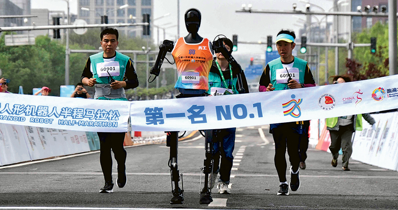 【明報專訊】北京昨(19日)舉行全世界第一場人形機械人半程馬拉松,有20組機械人參加比賽。共有來自北京、上海、廣東等地20家機械人團隊參賽。包括天工Ultra、松延動力N2、卓益得XO2、夸父、行者二號等機械人選手,與1.2萬名人類運動員共同挑戰21.0975公里賽道。在機械人跑手的較量中,最終由北京人形機器人創新中心的「天工Ultra」,以2小時40分42秒衝過終點奪冠。