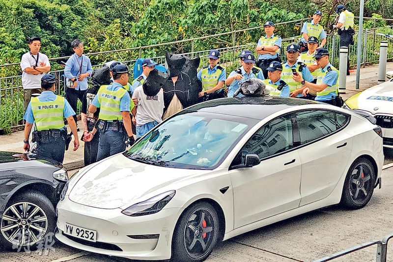 【明報專訊】一輛Tesla私家車昨天凌晨途經尖沙嘴漆咸道南警方路障,拒停逃去,狂飈至少14公里駛入火炭倔頭路,疑掉頭駛出時與追至警車迎頭相撞,車上4人被當場制服。警方搜車檢獲太空油、可卡因及大麻等,不排除該車是「毒品快餐車」。
