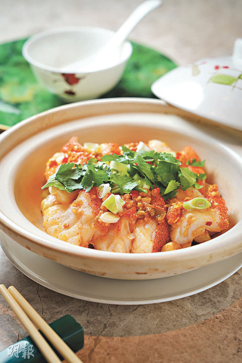 以一道「泡椒生啫星斑球」為例,未見其形,先聞其「啫啫」聲,甫一揭開煲蓋,濃郁香味瞬間撲面而來。砂煲底部只有一層薄薄的油,魚肉入口嫩滑,醬汁微辣中帶花雕酒香。張健明表示,為免過於油膩,他先將乾葱、蒜、薑在鍋內爆香後才放進砂煲底部,然後鋪上星斑片及自製泡椒醬,以生啫方式在煲中焗3分鐘,最後淋上10年花雕酒。他指,「生啫」是將生的食材直接放在鍋內,靠熱力及食材水分快速焗熟,掌握火候及時間非常關鍵,「底部的料頭不能燒焦,魚肉需要剛熟才爽滑,所以(魚肉)從廚房拿出來時其實仍未熟,但加上送到客人手上的路程,呈上桌時就剛好熟透」。