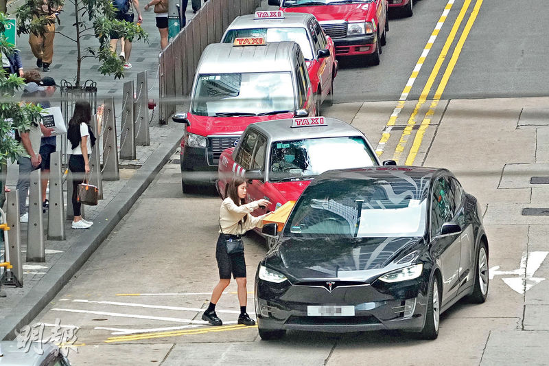 至於皇后大道中與畢打街違泊車輛較多,記者昨午接近1時觀察約20分鐘,見9輛車違規,包括4輛私家車在畢打行外雙黃線上落客;有4輛的士及一輛私家車停在雙黃線。其中,畢打街有的士停泊在雙黃線外約5分鐘,阻塞後方車輛前行,令皇后大道中與畢打街交界一度交通擠塞。