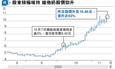 此外,楊協成公布,主席黃永光將於今天股東會後卸任,並由現獨立董事兼副主席,華僑銀行前高層藍宇鳴接任。另維他奶公布,昨日在市場內以平均價9.696元,回購18.4萬股,涉資178.4萬元。維他奶昨收報9.87元、跌0.8%,成交1530萬元。