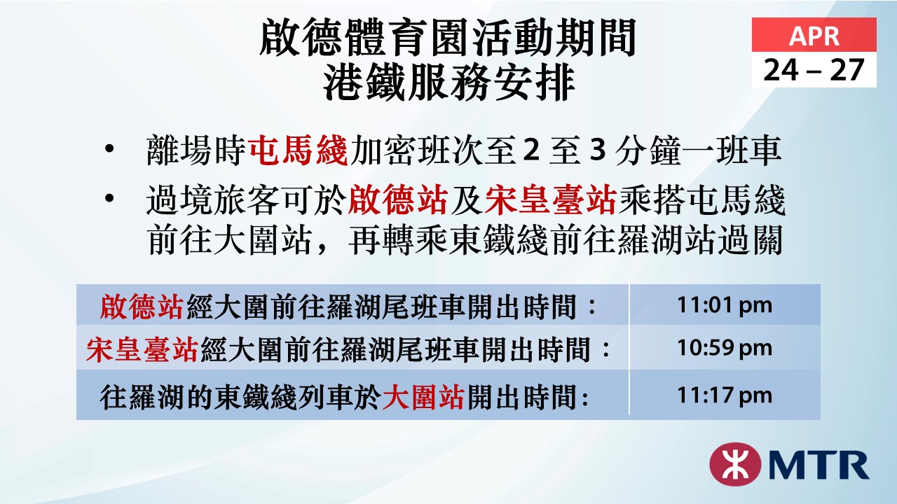 港鐵特別提醒過境旅客,可於啟德或宋皇臺站乘搭屯馬線前往大圍站,再轉乘東鐵線前往羅湖站過關,但強調由於演唱會預計晚上10時後結束,接近東鐵線往羅湖站的尾班車時間,他們應提早計劃行程。