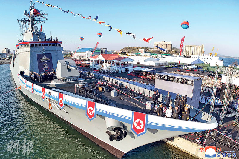 【明報專訊】朝中社昨日(26日)報道,朝鮮最高領導人金正恩上周五攜同女兒金主愛到平壤西南市郊的南浦造船廠,出席新型多用途驅逐艦「崔賢」號(圖,法新社)的下水儀式,朝方稱這艘排水量5000噸的戰艦配備「最強大武器」,只用400天即建成。金正恩形容朝海軍如今可作為「國防核心與核戰威懾的組成部分」。