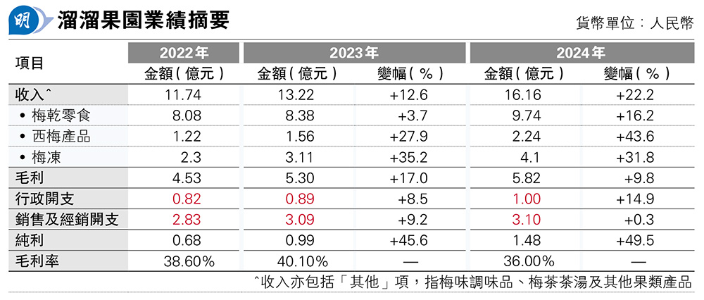 集團三大類產品當中,仍以梅乾零食為主要收入來源(見表),去年收入有9.74億元,佔總收入的60%,惟過去兩年,其梅凍產品收入增長相較快速,至去年收入佔總收入比例已達25%,較2022年提高約5.4個百分點。這發展趨勢對溜溜果園來說或是好事,事關其梅凍產品毛利率遠較梅乾零食為高,去年毛利率達47.8%,較梅乾零食的32.1%高出15.7個百分點;况且主打產品梅乾零食過去兩年毛利率持續下跌,2022年至2024年期間, 毛利率分別為39.6%、37.7%及32.1%,亦是集團去年總體毛利率收窄至4.1個百分點至36%的「主要推手」。