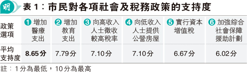 上述研究嘗試了解大眾對兩種可行性相對較高的稅收,包括增加對高收入者之稅率及資本增值稅的支持度。可是從表1可見,兩種稅收的平均支持度不太高。這裏首先點出的問題是,在沒有限制的情况下,市民不會明白資源來源及分配等問題:增加福利好不好?當然好;加稅好不好?當然不好。這種取態,一般政策如是,而有關自身利益時(如自己為加稅對象)則更嚴重。