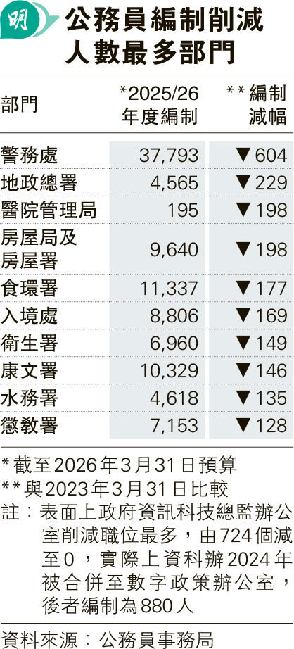 【明報專訊】公務員編制2021/22年度起維持「零增長」,政府未來兩個年度將各減2%,料本屆政府任內共削1萬個公務員職位。公務員事務局長楊何蓓茵昨日回應立法會書面質詢稱,預計明年3月公務員編制職位將較2022/23年度累計減少2930個。按部門劃分,編制最大的警務處將削減604個職位,數量是各部門最多。