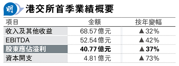 【明報專訊】港交所(0388)公布截至今年3月底止首季業績,受惠期內日均成交達2427億元創季度新高帶動,股東應佔溢利上升37%至40.77億元,按季亦增長8%,收入與盈利同創歷來季度新高,每股盈利3.23元,優於市場預期。港交所行政總裁陳翊庭表示,港交所將繼續善用立足中國的獨特優勢,擴大與全球市場的聯繫,確保有能力抵禦宏觀環境波動以及把握未來機遇。