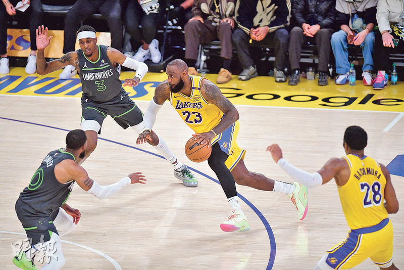 【明報專訊】西岸3號種子的洛杉磯湖人昨於NBA季後賽首圈第5戰,雖有「大帝」勒邦占士及盧卡當錫聯手攻入50分,但最終在主場以96:103不敵有中鋒高拔貢獻「超級雙雙」27分及24個籃板的6號種子明尼蘇達木狼,場數輸1:4遭對方「以下剋上」淘汰,連續兩屆「一輪遊」。