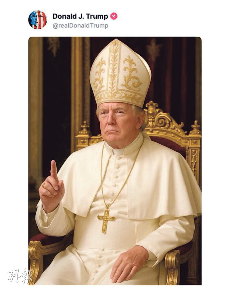 國際 特上載改圖扮「教宗」惹爭議 發佈於 5 個月 前 2025 年 5 月 4 日 By 明報 【明報專訊】美國總統特朗普上周五(2日)在旗下社交平台Truth Social上載「特朗普版教宗」個人AI改圖,白宮在社交平台X的官方帳號跟着轉載,惹來不少人批評他不尊重天主教、已故及未來教宗、全球天主教徒。特朗普上周二被記者問及希望誰出任新教宗時,曾開玩笑稱是他本人,「我想當教宗,那是我的首選」。 (網上圖片) 相關文章: Up Next 巴菲特年底退休 巴郡交指定繼任人 股東會上批特朗普關稅戰 「貿易不應作武器」 不要錯過 美宣布淡出調解 促俄烏直接談判 繼續閱讀 贊助商 猜你喜歡