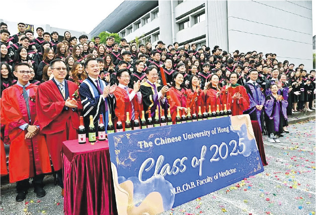 拍攝畢業照當日,我和中大醫學院2025年畢業同學緬懷他們剛進入醫學院的第一年,遇上反修例風波和新冠疫情,大大影響了上課學習的機會。但我相信這些經歷將會令這屆畢業生更能踏實地成為好醫生。希望所有畢業生在慶祝「夢想成真」成為醫生的同時,亦要緊記「毋忘初心」,要為救治病人而付出你們寶貴的精力和時間。