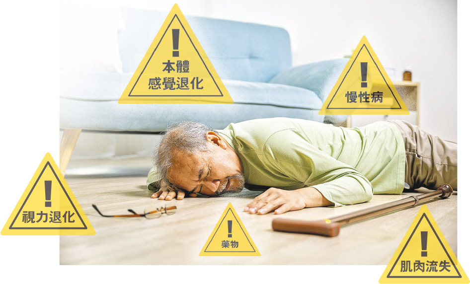 還有一個「隱形殺手」——本體感覺退化,即腳底神經像老舊的感應器,無法即時回傳地面高低信息給大腦,我們便容易跌倒。此外,若合併慢性病如柏金遜症或糖尿病周邊神經病變,風險倍增。值得注意的是,許多藥物如鎮靜劑、利尿劑會造成脫水或低血壓,門診中約三成長輩跌倒都與用藥相關,卻常被忽略。當然,外在因素也不容忽視,例如居家照明不足、地板濕滑、雜物堆放,都可能成為潛在危險。既然如此,預防跌倒便是我們人生下半場的功課。既是功課,便應該勤做及必做。