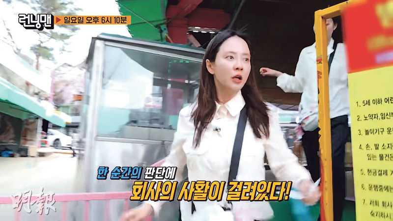 【明報專訊】韓國SBS電視台人氣綜藝節目《Running Man》(RM)前日播出最新一集,成員宋智孝因遲到惹來爭議。《RM》當日在京畿道東北部抱川巿取景,以年輕創業家為主題。一眾成員劉在錫、池石鎮、金鐘國、Haha、梁世燦、池睿恩及崔丹尼爾以華麗造型登場,唯獨不見宋智孝蹤影,池石鎮代為解釋,「智孝今日駕車前來,結果在抱川巿附近迷路了」。約半小時後,宋智孝氣喘吁吁跑來,並連聲道歉,「對不起,這個山坡真的太要命了」,笑言「其實我是去賣內衣才遲到的」。