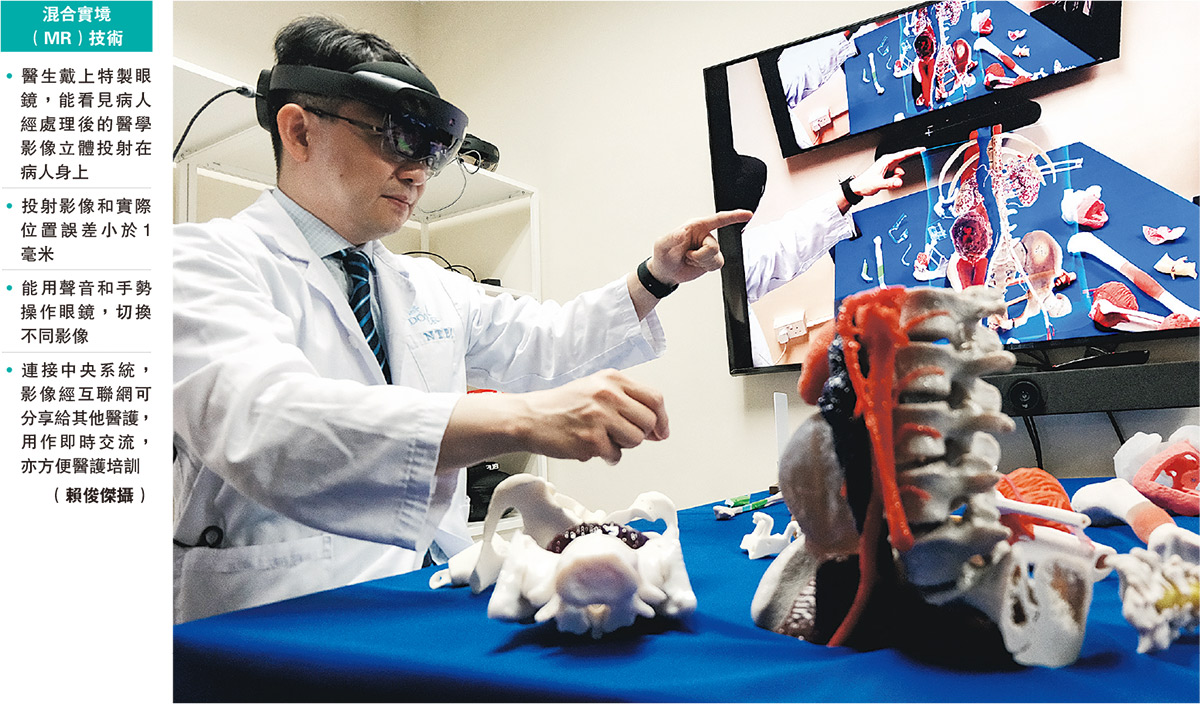 2021年起,威院研發MR技術,讓影像不再局限平面,而是能立體呈現。醫生透過佩戴特製眼鏡,可看到病人體內器官的虛擬影像投射在患者身上,兩者誤差小於1毫米;眼鏡可透過聲音或手勢操作,方便醫生同步處理其他工作。同時,由於眼鏡接駁中央系統,影像甚至可同步分享給其他醫護,方便團隊作即時交流。黃國全說,技術不僅提升手術成功率,亦令醫護的培訓工作更順暢。