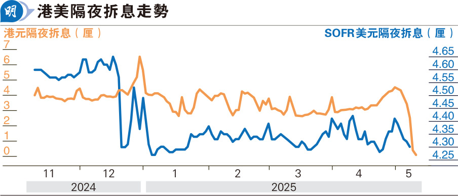 外匯交易以隔夜息為指標,港元隔夜拆息昨跌至不足0.1厘,較4月30日大跌4.4厘,較美元隔夜拆息差距,由4月底高出0.09厘,急逆轉為低4.2厘。套息交易需要借取港元,至於能否推動港元拆息上升,李若凡稱借港元沽出難以推升拆息,而是需要港元有額外的需求,她認為至6月半年結,以及7月至8月港股派息高峰期,出現套息以外的季節性需求。另外若加上港股吸引資金流入,帶動港元重新上升,令現時沽出港元的套息交易再次拆倉,屆時亦會增加港元需求,預期1個月拆息現時在1.5厘至1.8厘盤整,至6月至8月再次回升至2厘以上,不過銀行體系總結餘已經回升至1700億元水平,所以1個月拆息也不會回到以往4厘水平。